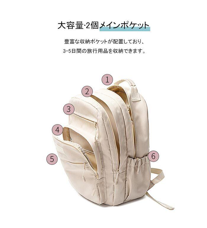 豊富な収納ポケットが配置しており、3-5日間の旅行用品を収納できます。A4サイズの書類やファイルをすっぽりと簡単に収められます。教科書、携帯、折りたたみ傘、水筒、手帳、化粧品、鍵など日常の必需品もたっぷり入れます。