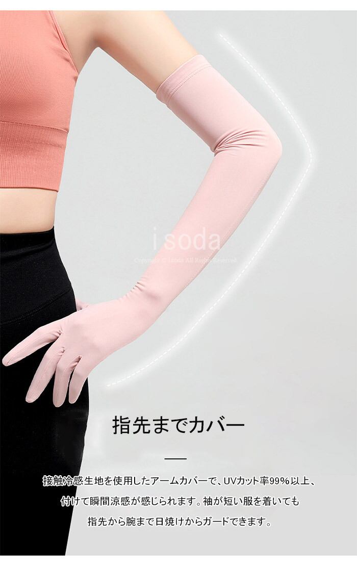 接触冷感生地を使用したアームカバーで、UVカット率99%以上、付けて瞬間涼感が感じられます。袖が短い服を着いても指先から腕まで日焼けからガードできます。