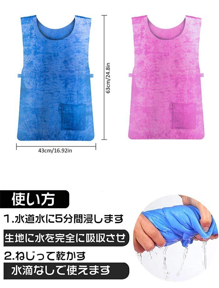 吸水性と保水性がよいのPVA材を採用、冷却器不要、冷却ファン不要、保冷剤不要の熱中症対策 ベストです、水道水だけに3-5分ぐらい浸けて十分に吸水させてから利用できます。 夏場の工事現場や建築作業場などのために開発した最新品熱射病対策ベスト。ベストサイズ:63 X43cm。