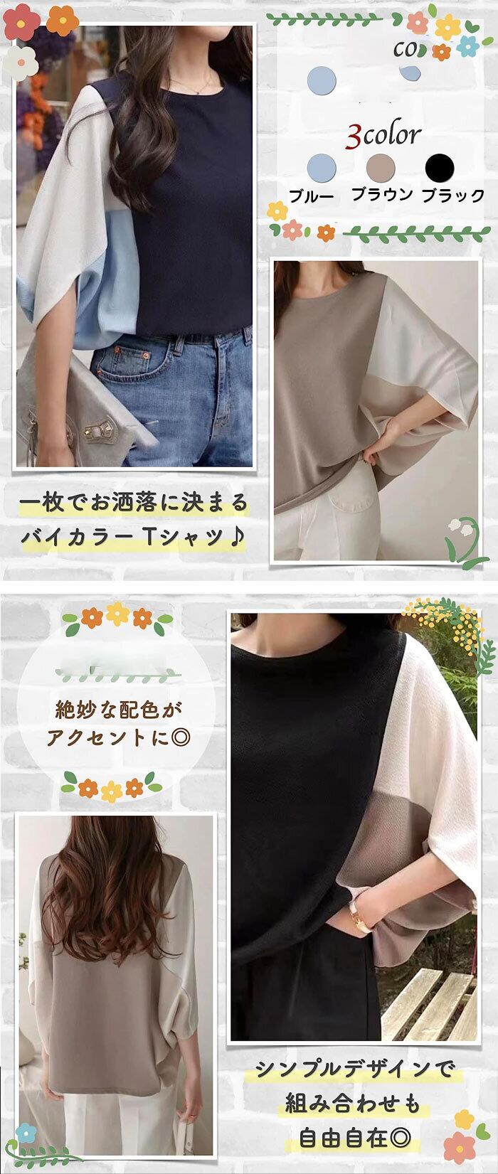 Tシャツ トップス カットソー プルオーバー レディース 袖あり Tシャツ おしゃれ バイカラー 春夏 無地 ドルマンスリーブ 五分袖 サマーカットソー ボートネック ビッグシルエット 薄手 体型カバー ゆったり | isoda