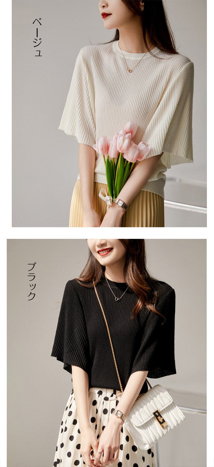 ニット サマーニット ニットトップス セーター フレアスリーブサマーニットフレアトップス リブニット レディース tシャツ 半袖 春夏 カットソー 半袖カットソー フレア 伸縮性 リブ シンプル 無地 | isoda