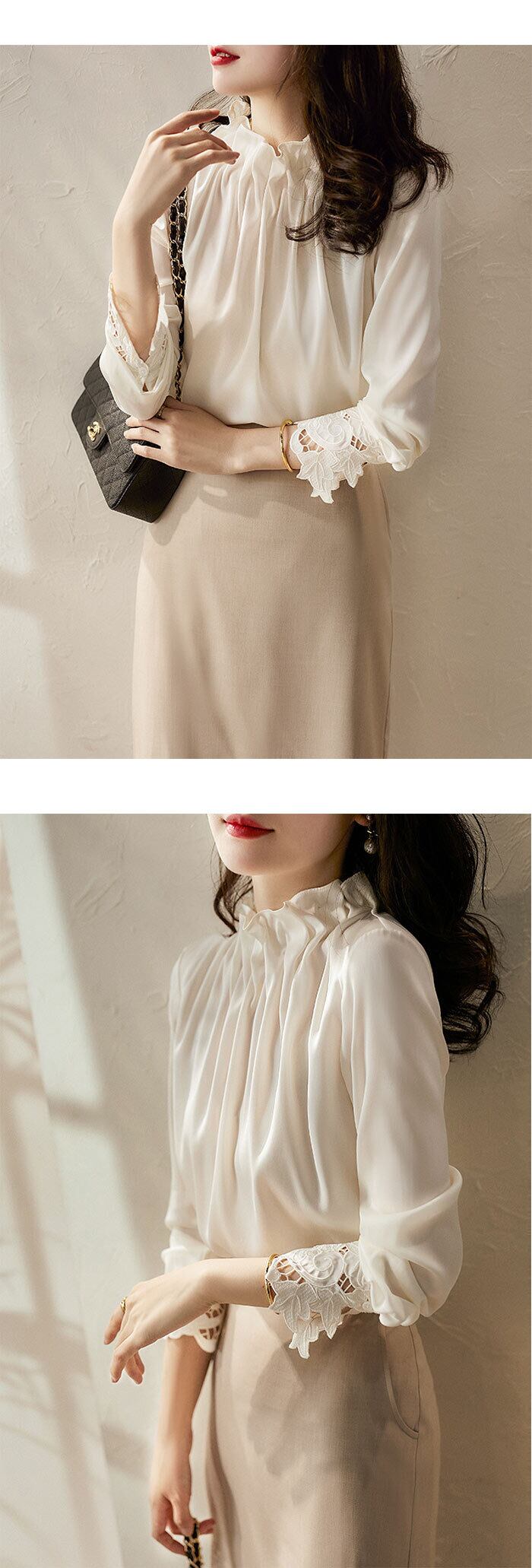 長袖 ブラウス レディース フリルネック フリル襟 シャツ トップス ハイネック レース袖 フォーマル 華やか 光沢感 ギャザー オフィス カジュアル 春夏秋 通勤 仕事 おしゃれ ゆったり 大きいサイズ | isoda